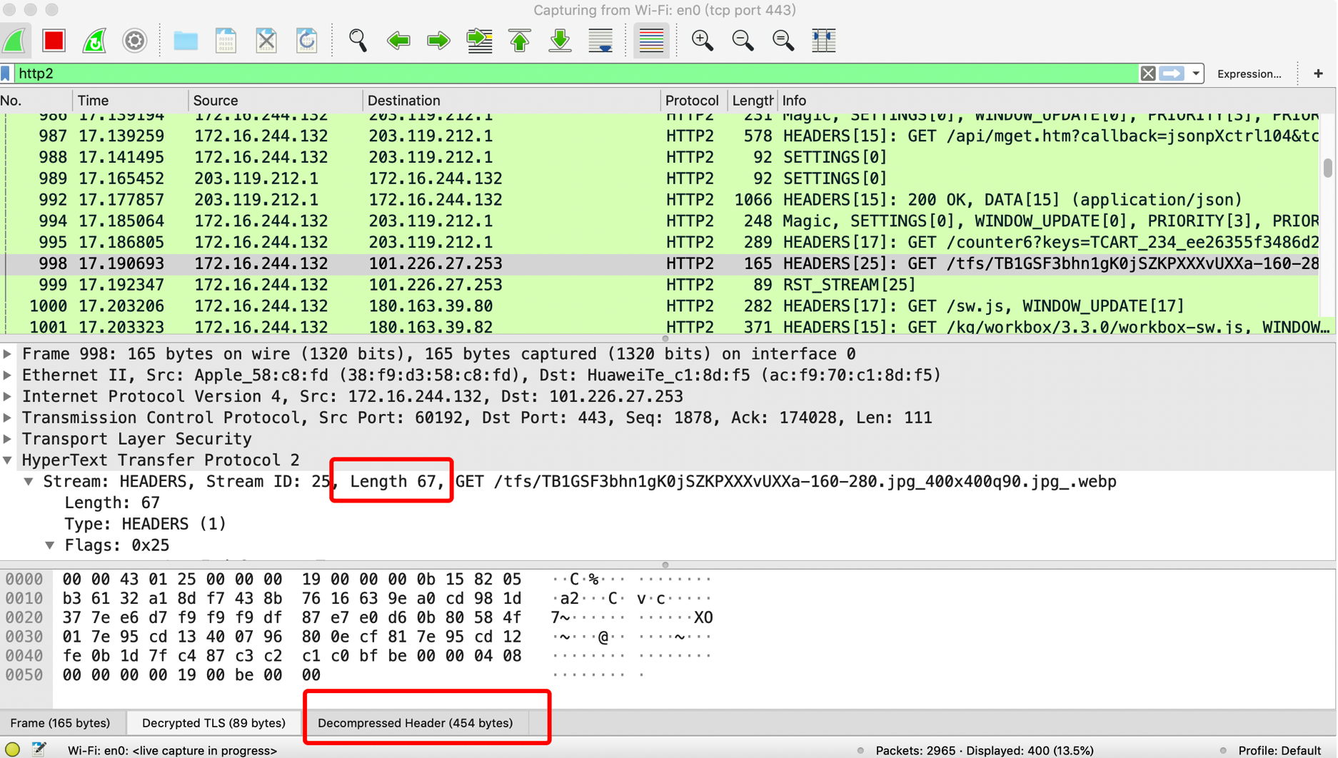 可以看到经过压缩后的头部长度只要67个字节,而解压后的头部却有454个字节。