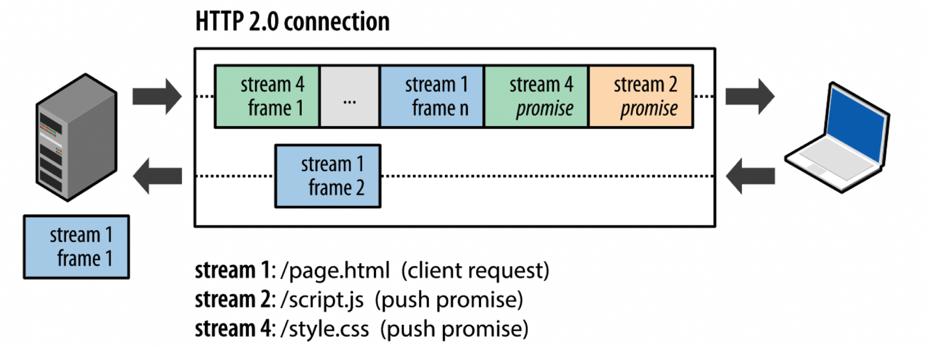 一个典型的web程序由很多资源组成,但所有这些资源都是客户端通过检查服务端所提供的文档发现的。而服务端推送可以让服务器除了响应原始请求以外,还可以把其他资源推送到服务端,客户端不必请求每个资源,减少了浏览器接收响应并解析html的时间。推送的资源必须遵循同源策略。如下图所示: