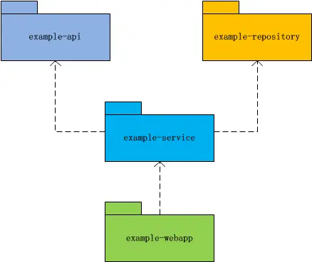 表现层项目(example-webapp)可以调用业务层项目(example-service)中的任意服务函数,甚至于越过业务层直接调用持久层项目(example-repository)的DAO函数。