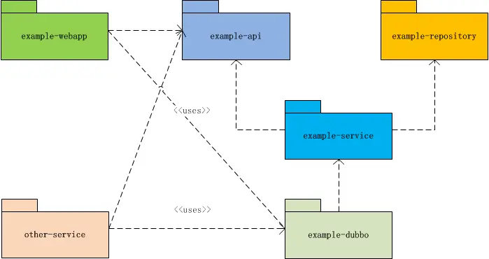 | 5 | example-webapp | war | 对应表现层,实现了Controller等,通过Dubbo调用服务 |