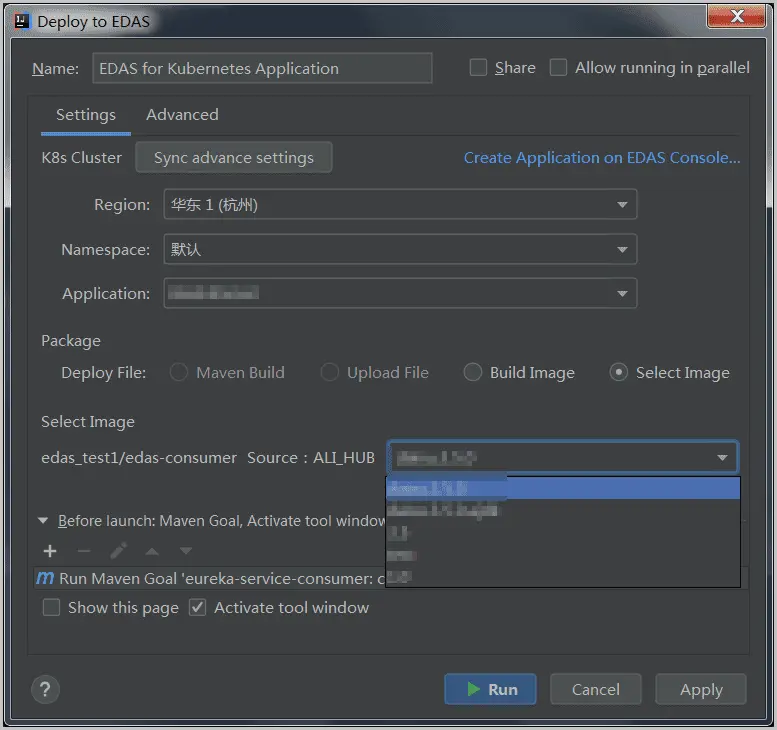 Deploy to EDAS -> EDAS for Kubernetes Application; - 在 Deploy to EDAS 对话框配置应用部署参数(如果您还没有在 EDAS 上创建应用,在对话框右上角单击