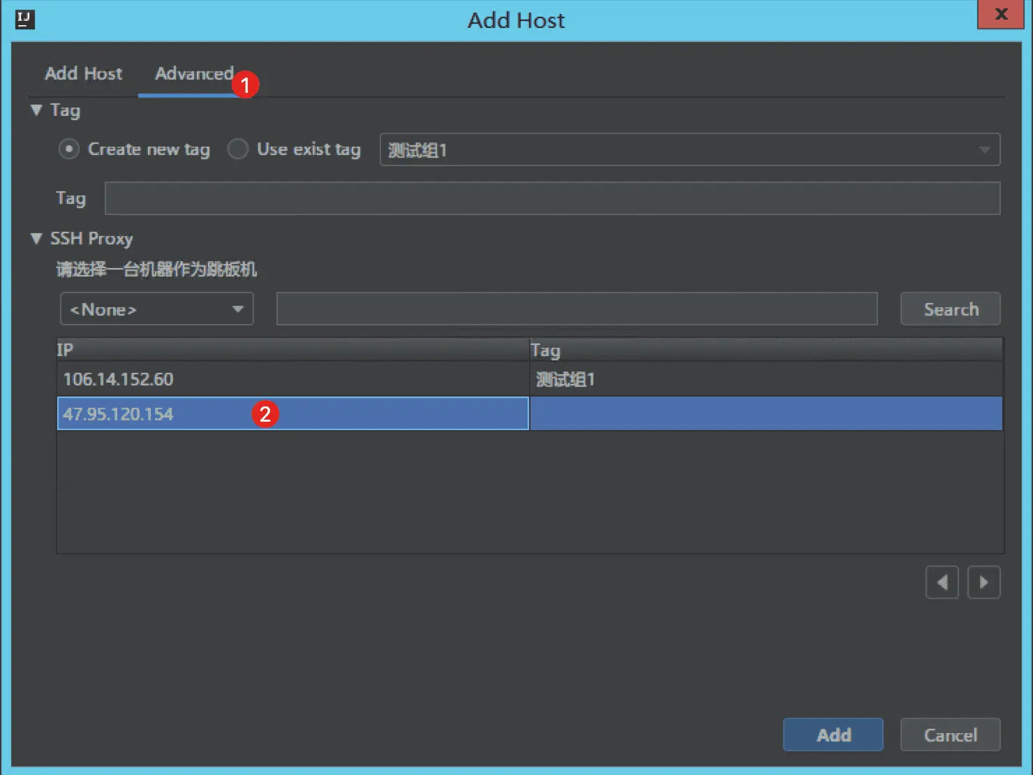 Advanced标签页,在 SSH Proxy 项中选择刚刚添加的机器 P:47.95.120.154,点击Add按钮 完成添加。