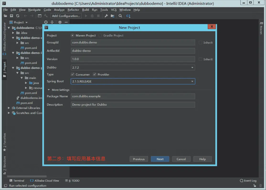 - 如下图,填写基本信息,包括 Dubbo 版本、Spring Boot 版本等;