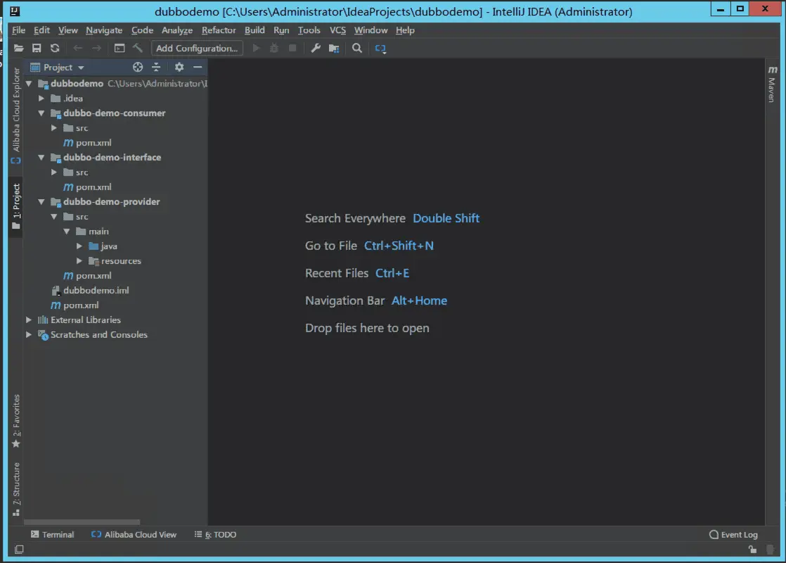 如下图所示,就完成了一个完整的 Dubbo 工程的创建了,此工程的结构和 Apache Dubbo 官方样例工程完全一致。