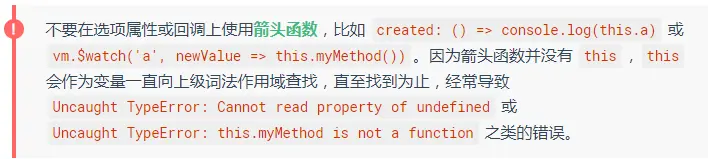 this上下文到实例中,因此你可以访问数据,对属性和方法进行运算。这意味着你不能使用箭头函数来定义一个生命周期方法 (例如created: () => this.fetchTodos())。这是因为箭头函数绑定了父上下文,因此this与你期待的Vue实例不同,this.fetchTodos的行为未定义。