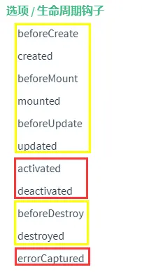 beforeCreate:在实例初始化(new)之后,数据观测data observer和 事件配置event/watcher之前被调用。created:实例创建完成后被调用。在这一步,实例已完成以下的配置:数据观测(data observer),属性和方法的运算,watch/event事件回调。 然而,挂载阶段还没开始,$el属性目前不可见。beforeMount:在挂载开始前被调用:相关的render函数首次被调用。mounted:el被新创建的vm.$el替换,并挂载到实例上去之后调用该钩子。如果root实例挂载了一个文档内元素,当mounted被调用时vm.$el也在文档内。注意:mounted不会承诺所有的子组件也都一起被挂载。如果你希望等到整个视图都渲染完毕,可以用vm.$nextTick替换掉mounted。。beforeUpdate:数据更新时调用,发生在虚拟DOM重新渲染和打补丁之前。 你可以在这个钩子中进一步地更改状态,这不会触发附加的重渲染过程。updated:由于数据更改导致的虚拟DOM重新渲染和打补丁,在这之后会调用该钩子。 当这个钩子被调用时,组件DOM已经更新,所以你现在可以执行依赖于DOM的操作。然而在大多数情况下,你应该避免在此期间更改状态,因为这可能会导致更新无限循环。如果要相应状态改变,通常最好使用计算属性或watcher取而代之。。beforeDestroy:实例销毁之前调用。在这一步,实例仍然完全可用。destroyed:Vue实例销毁后调用。调用后,Vue实例指示的所有东西都会解绑定,所有的事件监听器会被移除,所有的子实例也会被销毁。activated:keep-alive组件激活时调用。被调用。deactivated:keep-alive组件停用时调用。。errorCaptured:当捕获一个来自子孙组件的错误时被调用。此钩子会收到三个参数:错误对象、发生错误的组件实例以及一个包含错误来源信息的字符串。此钩子可以返回false以阻止该错误继续向上传播。