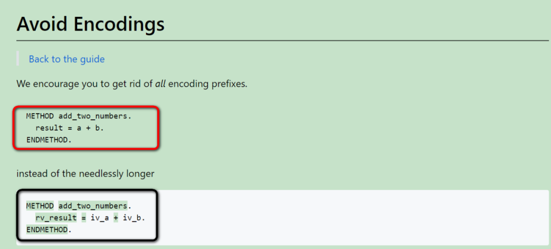 SAP这个github文件给出的推荐是,建议在给方法实现里的变量名取名时,避免使用前缀。下图红色高亮的代码是推荐的做法,而黑色的代码是应该避免的代码。