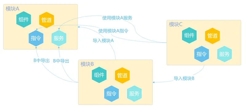 3.模块C导入模块B后则可以使用模块A的指令和服务而不需要再次导入A