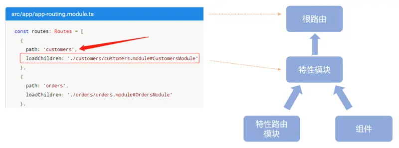 在开发过程中经常可见惰性加载的例子,如在数据量大时,树的加载通常只加载一级节点数据,当有需要时才加载子节点数据。惰性加载的目的是缩短单次交互的时间,提升客户体验。为了避免将所有模块代码一次加载到客户端,Angular支持模块惰性加载,只有带路由的特性模块才能惰性加载。特性加载的实现如下:
