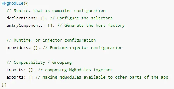 1.@NgModule是一个装饰器,声明某个类是Angular模块,看起来很像Java的注解,但实际有很大不同,前者用于在编译期给编译器编译代码,后者用于在运行期控制代码逻辑。