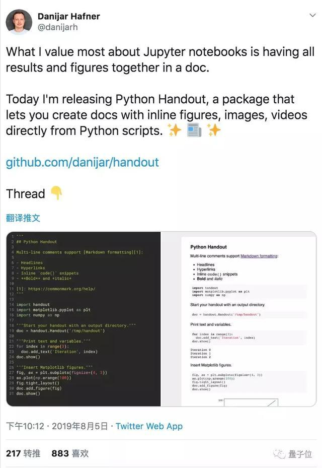和Jupyter的升级版Jupytext的区别在于,Jupytext可以在笔记本和源文件之间转换,而Python Handout是一个导入脚本的库,可以控制给文档中添加媒体文件的时间和位置,比如在脚本运行时更新文件报告算法进度。