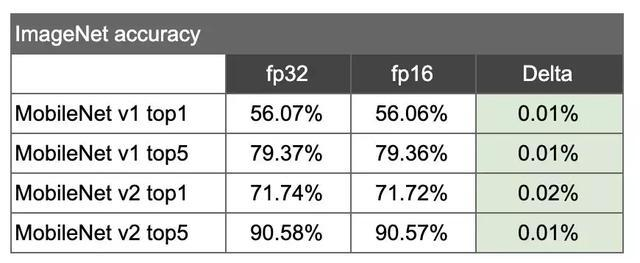 在ILSVRC 2012图像分类任务上分别测试标准的MobileNet float32模型和float16模型变体,可以看到,无论是MobileNet v1还是MobileNet v2,无论是top1还是top5,fp16模型的精度损失都小于0.03%。