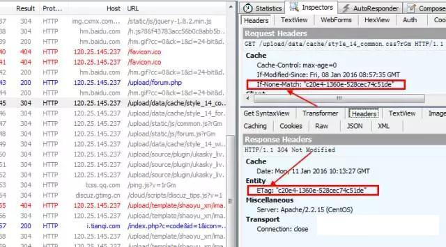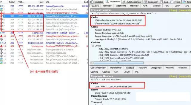 当按F5再次刷新论坛主页时,对比客户端If-None-Match和服务端Etag值是一样的,说明不用更新缓存。