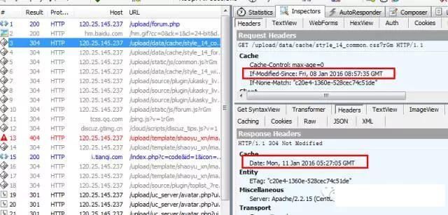 用F5刷新当前页面(找到/upload/data/cache...这项),会发现不管怎么刷新,If-Modified-Since后面的请求时间都没有变,并且If-Modified-Since时间大于response headers里的Data时间,如下图: