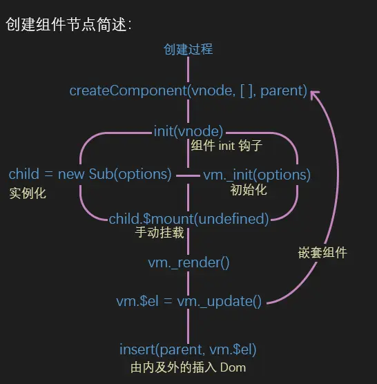 无论是嵌套多么深的组件,遇到组件的后就执行init,在init的__patch__过程中又遇到嵌套组件,那就再执行嵌套组件的init,嵌套组件完成__patch__后将真实的Dom插入到它的父节点内,接着执行完外层组件的__patch__又插入到它的父节点内,最后插入到body内,完成嵌套组件的创建过程,总之还是一个由里及外的过程。