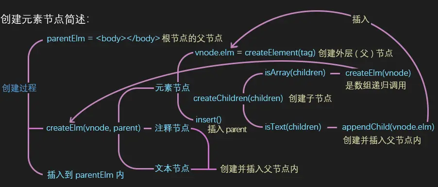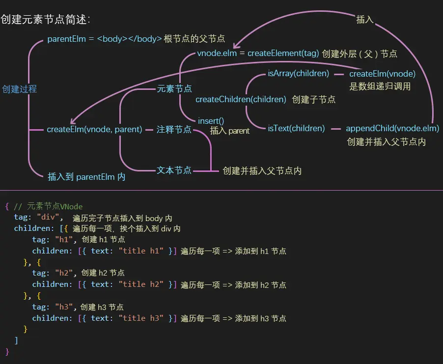 这里大家记住一句话即可,无论VNode是什么类型的节点,只有三种类型的节点会被创建并插入到的Dom中:元素节点、注释节点、和文本节点。