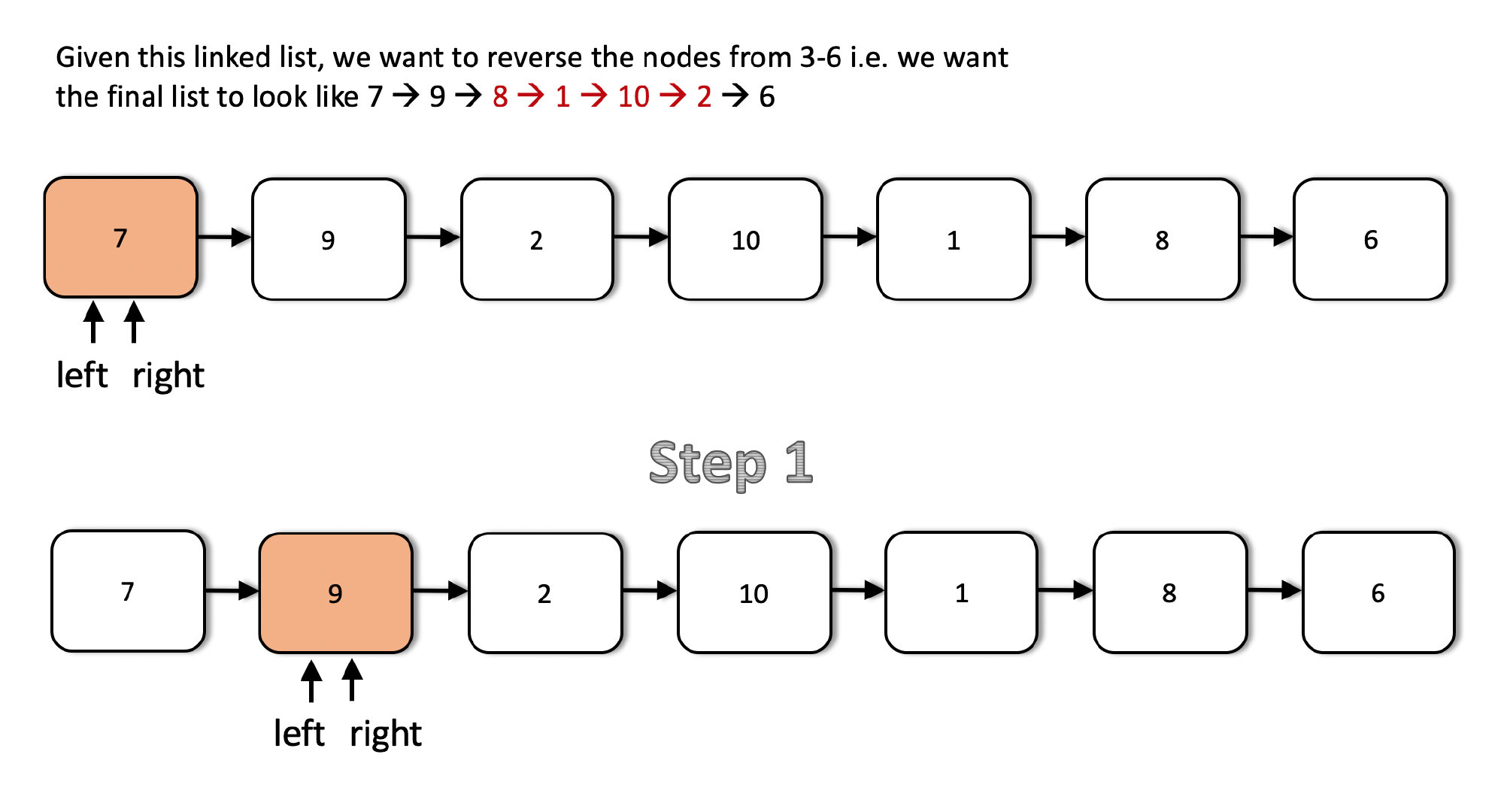 这是递归过程的第一步。给定所用链表,left 和 right 指针从链表的 head 开始。第一步是以更新过的 m 和 n 进行递归调用,换而言之,它们的值各自减 1。此外,left 和 right 指针向前移动一位。
