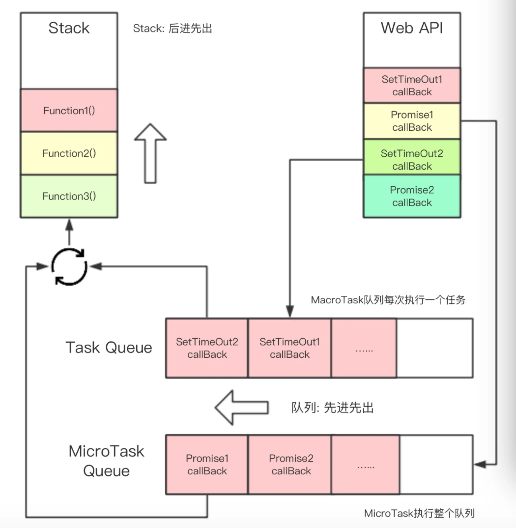 第二点提到,Web API会处理异步事件,将异步回调推入任务队列,任务队列又分为宏任务队(MacroTask queue)和 微任务队列(microTask queue)。首先执行MacroTask队列中的一个宏任务,然后执行microTask队列中的所有微任务。接着开始下一次循环。