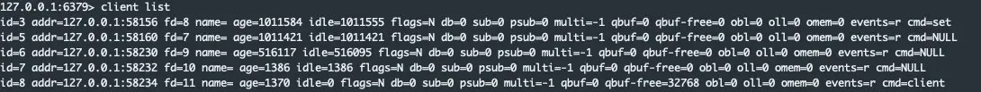 伪客户端(fake client)的 fd 属性的值为 -1 : 伪客户端处理的命令请求来源于 AOF 文件或者 Lua 脚本, 而不是网络, 所以这种客户端不需要套接字连接, 自然也不需要记录套接字描述符。 目前 Redis 服务器会在两个地方用到伪客户端, 一个用于载入 AOF 文件并还原数据库状态, 而另一个则用于执行 Lua 脚本中包含的 Redis 命令。 普通客户端的 fd 属性的值为大于 -1 的整数: 普通客户端使用套接字来与服务器进行通讯, 所以服务器会用 fd 属性来记录客户端套接字的描述符。 因为合法的套接字描述符不能是 -1 , 所以普通客户端的套接字描述符的值必然是大于 -1 的整数。 执行 CLIENT_LIST 命令可以列出目前所有连接到服务器的普通客户端, 命令输出中的 fd 域显示了服务器连接客户端所使用的套接字描述符: