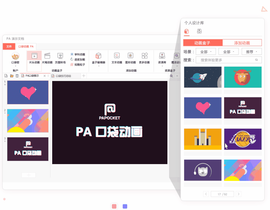 PA口袋动画这一插件主要应用在PPT中,PA口袋动画里面有很多炫酷的动画,快闪动画、文本动画、片头动画、片尾动画等等,有了它,制作PPT的时候再也不用为动画而忧愁了!
