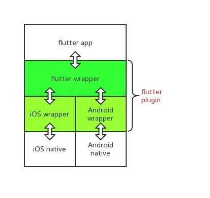 Flutter Plugin 可简单理解为上图中的 Flutter wrapper , iOS wrapper , Android wrapper 三个绿色部分,图中的双向箭头表明了代码的调用逻辑,这就是为什么说 Flutter 的插件可以跨平台使用。
