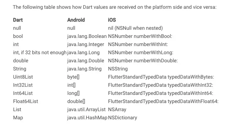 上面这张表罗列了 Flutter 使用的 Dart 语言与 iOS/Android 可以传递的数据类型,从表中我们可以看到,它只能传递一些基本的数据类型,比如 bool,int,double,高级的就是 String,List,Map,而且表中指明了在各平台对应的数据类型转换:如 Dart 的 Map 对应 Android 的 HashMap,对应 iOS 的 NSDictionary 。