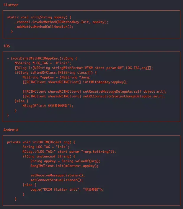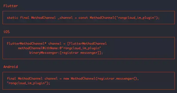 Flutter 通过 MethodChannel 与 iOS/Android 进行交互,下面的代码展示了三个平台如何创建 MethodChannel 对象。