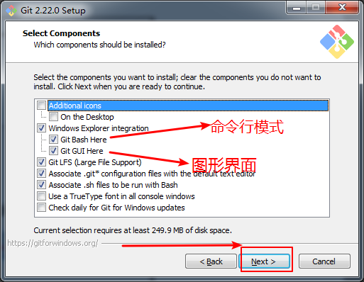 Git安装 一个菜鸟中的小白 2019-08-07 129 阅读1分钟 下载安装 1. Git官网下载 2.安装 1)双击 2)选择安装目录 3)选择安装组件(默认即可) 4)开始菜单目录名设置 5)默认下一步 6)选择使用命令行模式 7)以下三步默认next 8) 安装 3.检验安装是否成功
