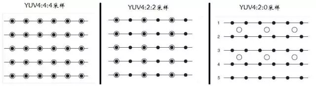 ImageReader还能设置图像的格式, 除了RGB外, 另一种常用的格式是YUV. 它也是用像素点的分量来表示图像, 不同的是, 它的Y分量代表亮度, U和V两个分量代表颜色. 这样表示的好处是彩色与黑白画面的转换很方便, 去掉UV就是黑白的, 也就是灰度; 并且Y分量可以做一定的压缩, 比如每两个或四个像素点取一个Y分量, 以节省空间, 这就产生了不同格式的YUV, 如下图:
