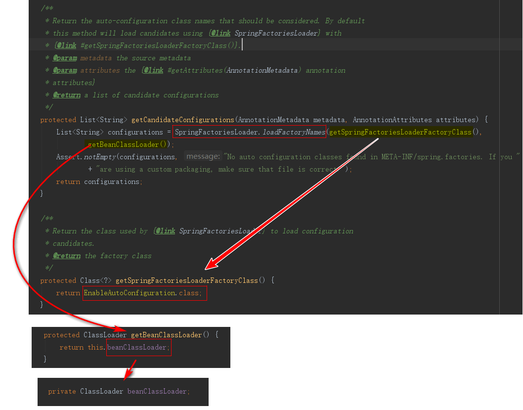 查看AutoConfigurationImportSelector类的源码,它依赖于SpringFactoriesLoader的loadFactoryNames方法,来获取一组自动配置类名。