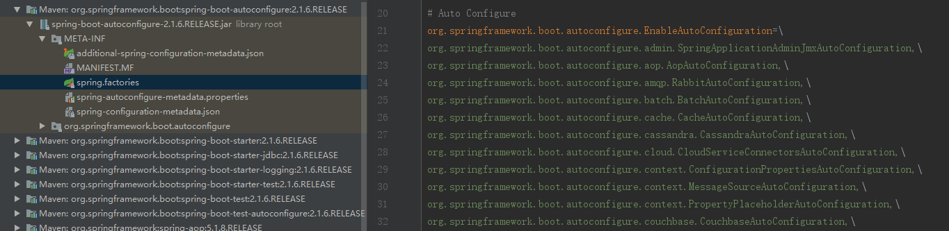 它的主要功能就是从指定的配置文件META-INF/spring.factories加载配置,配置的格式为Key = Value形式,只不过key和value都是Java类型的完整类名,比如: