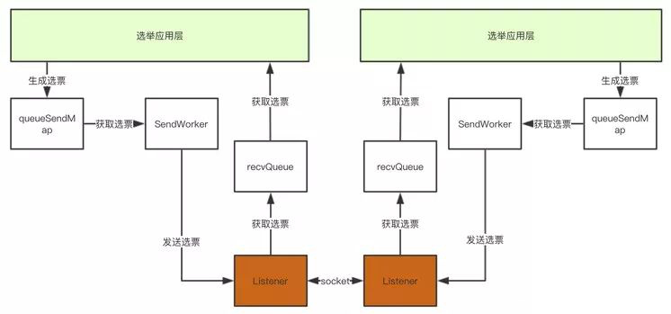 所以架构可以演化为下图,通过这个架构,选举应用层直接从recvQueue中获取选票,或者选票添加到queueSendMap中既可以完成选票发送: