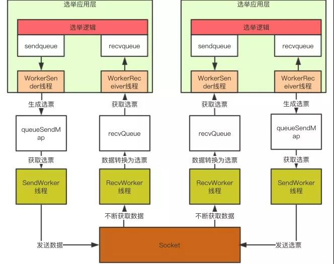 这样在应用层了,只需要将待发送的选票信息添加到sendqueue中即可完成选票信息发送,或者从recvqueue中获取元素即可得到选票信息。