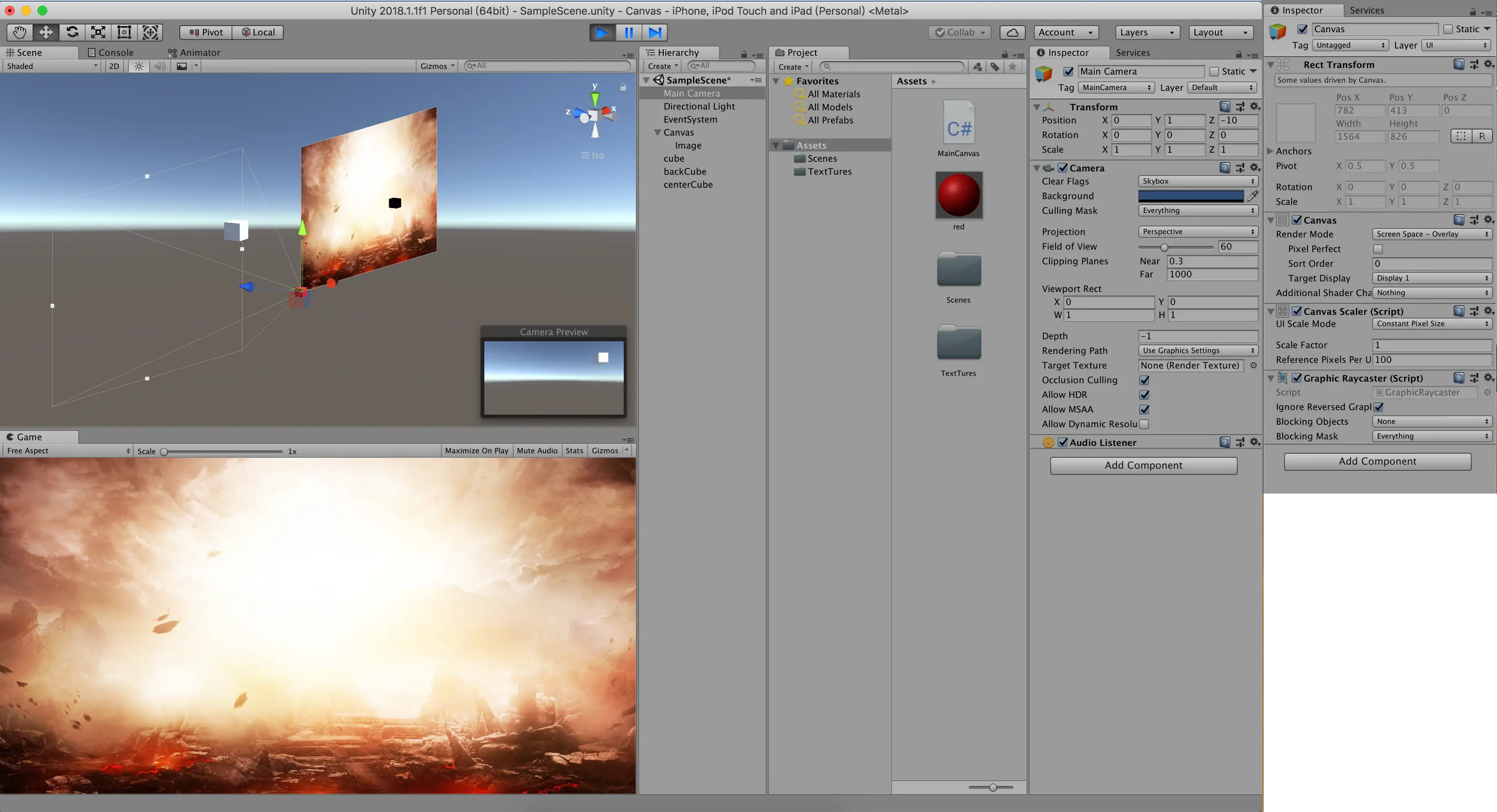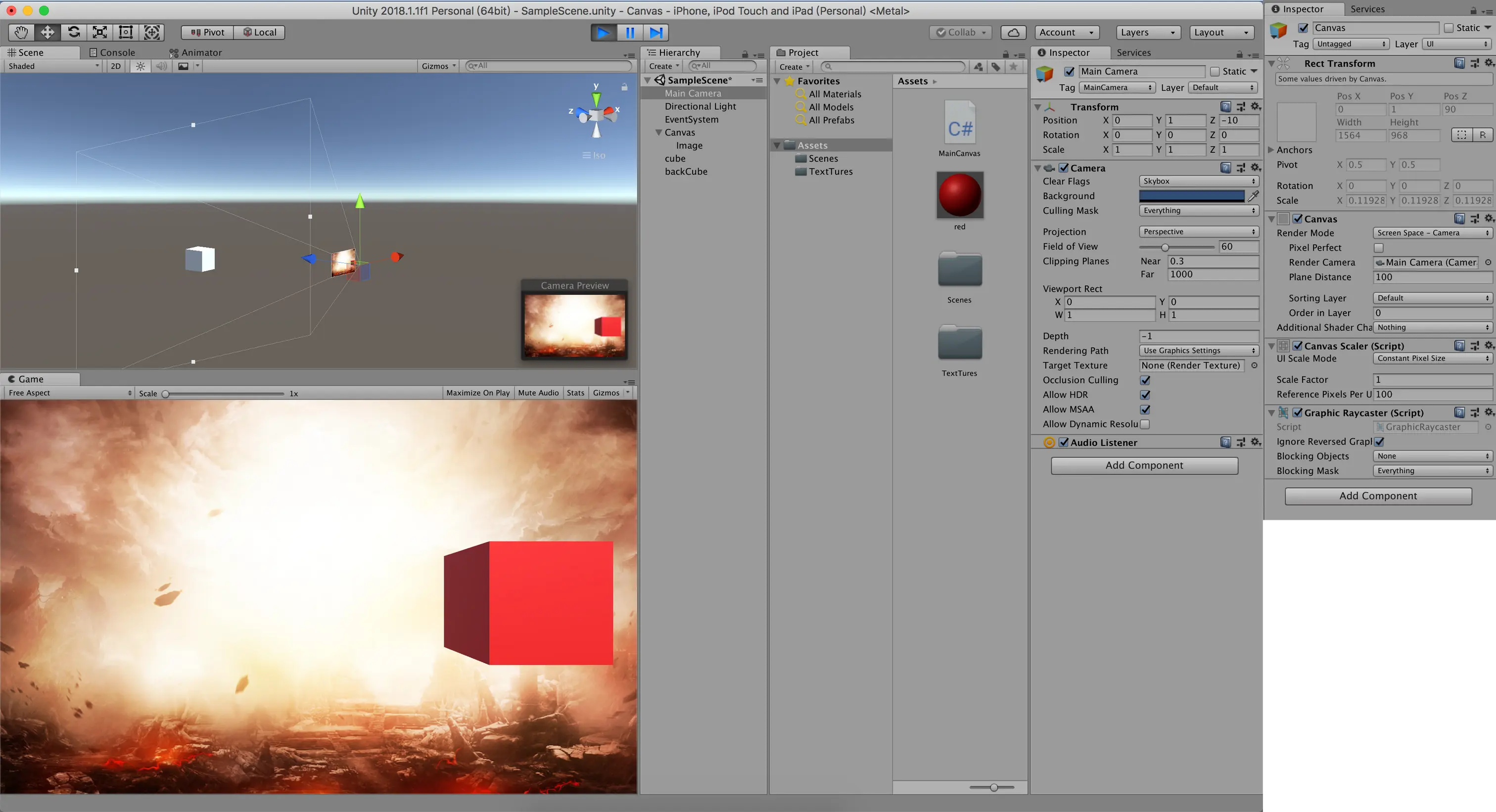 Canvas组件解读 RenderMode有三种,分别是ScreenSpace-Overlay、ScreenSpace-Camera、WorldSpace ScreenSpace-Overlay:Canvas覆盖整个屏幕,屏幕只显示Canvas的内容。无论Canvas之外的内容如何放置都不会在"Game"视图显示。如下图3个Cube物体,Game视图中只显示Canvas内容