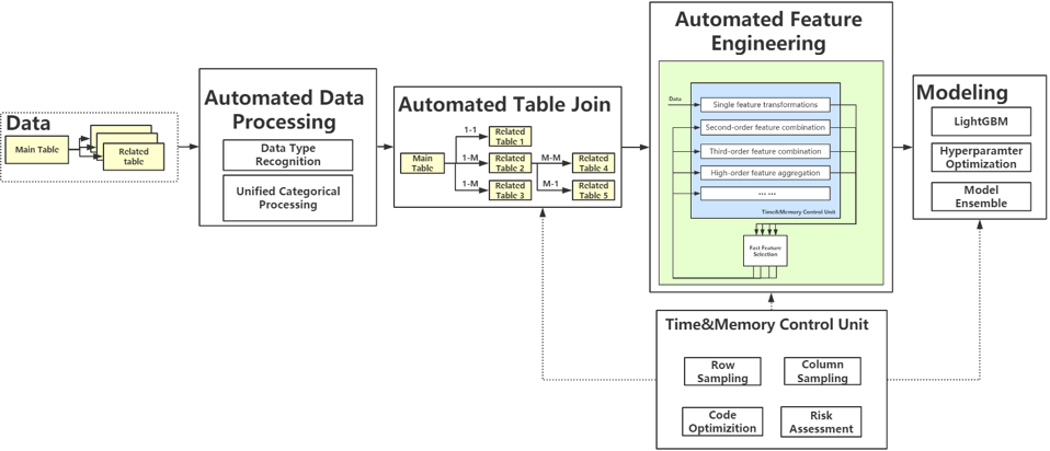 在这次竞赛中我们的工作围绕着竞赛的挑战而进行,主要有几个比较重要的过程:自动化多表数据处理、自动多表连接、自动化特征工程、自动化模型构建、选择和融合。同时为了满足竞赛的时间和内存的需求,我们在代码上做了相当多的优化,比如使用了多线程、Cython、预处理、提前估算等方法。最后我们的成绩相当不错,A,B 榜单上均在多个任务集上有比较大的优势。
