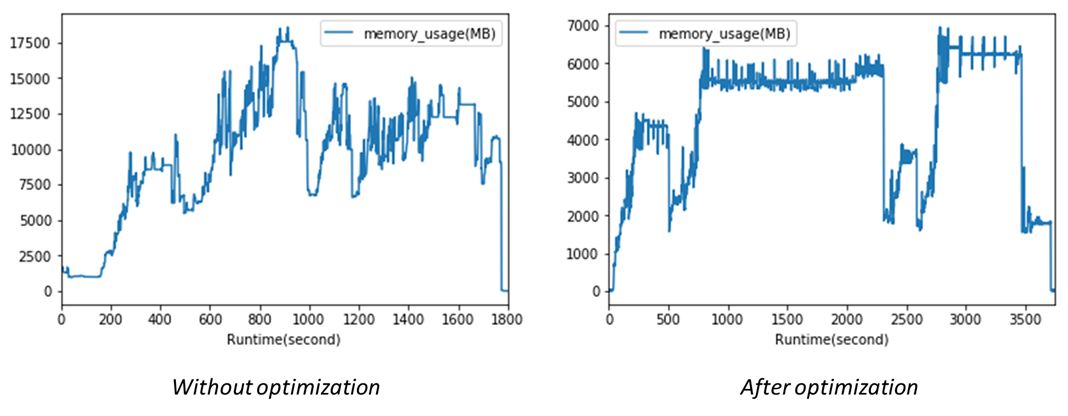 最后,我们会做一些比较精细的内存管理,在变量生命周期结束的时候,我们都会对其进行内存回收。以下是我们内存优化前后的一个对比。里面包含了比赛中给的 5 个数据集的运行过程中的内存情况。