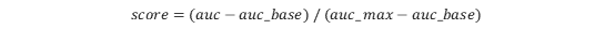 本次比赛采用 AUC 作为评分指标,排名规则以官方给出的 baseline 得分 auc_base 为 0 分基准,以所有选手最高成绩 auc_max 为满分 1 分基准,按照公式得出相对分数,最后算出 5 个数据集的平均分为最终得分,得分越高代表模型性能越好。得分计算公式如下: