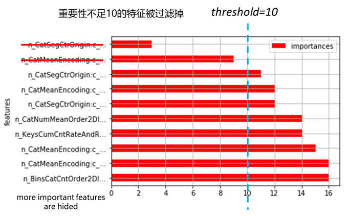 此外,在特征工程的组合特征模块中,同样用到了采样的思想。组合特征的特点是产生的特征数量多,特征工程的时间长,内存峰值高,起作用的特征数量少。因此,为了避免内存溢出,我们在做组合特征之前,在小数据集上进行特征工程,经过筛选后得到真正有效的特征,再在整个数据集上仅做出这些有效的特征这样不仅可以减少系统运行时间也能避免爆内存的风险。