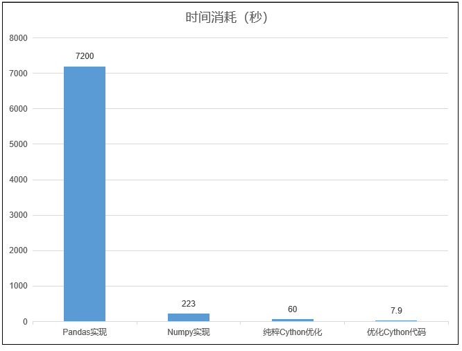 我们退而求其次,使用 numpy 来实现该特征,特征的生成时间直接到达了几十秒的级别,但是这仍旧不能满足我们的要求。最后我们对这块代码使用 cython 去优化,并且对 cython 代码进行精雕细琢,最后该特征的生成只需要几秒。