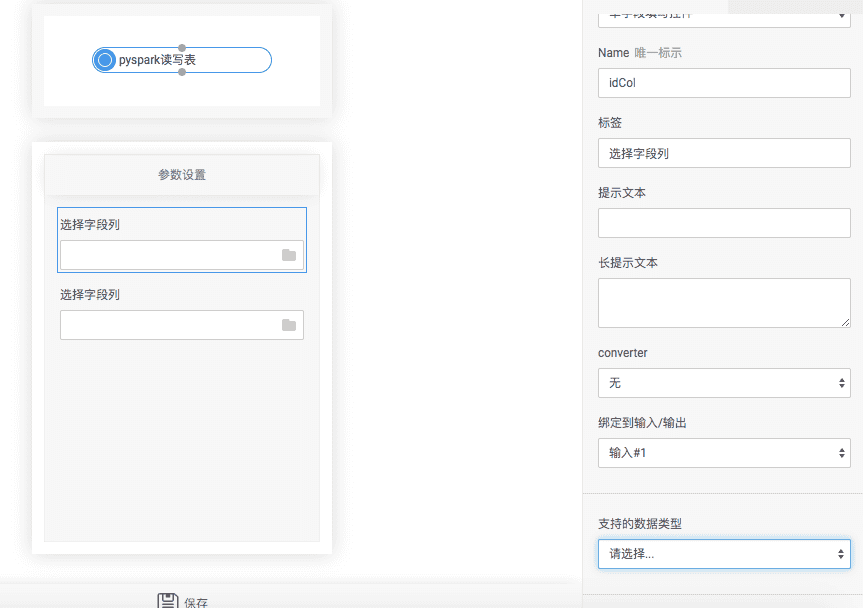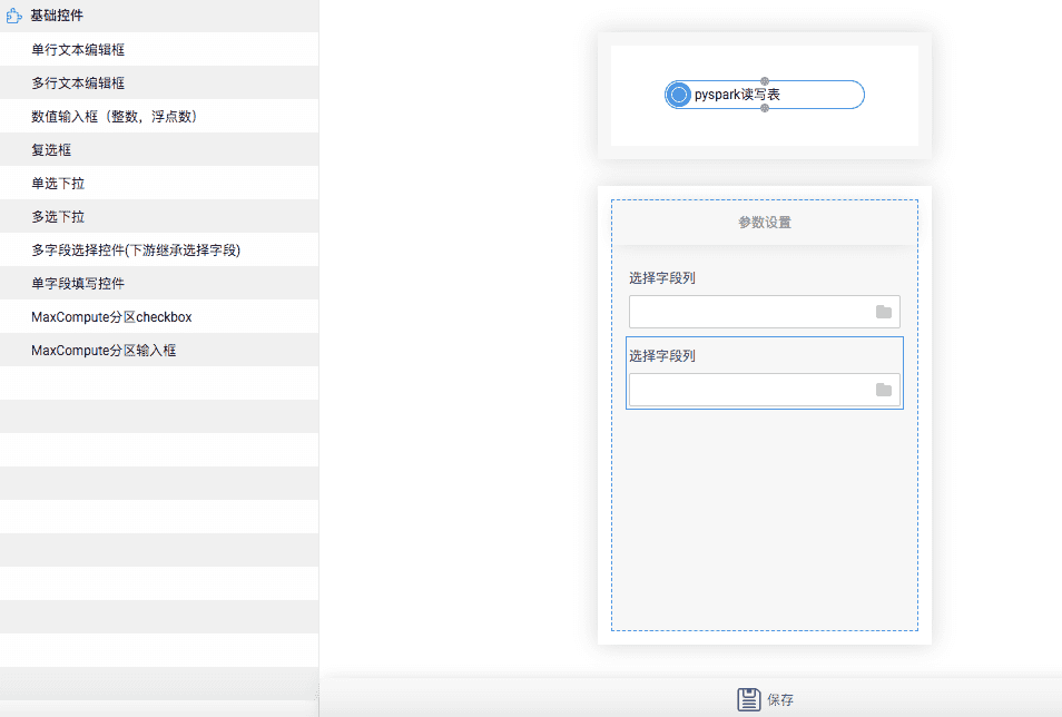 接下来编辑配置信息,在上述代码中除了inputTable和outputTable这两个参数,剩下的所有参数都要对应到组件的基础控件。本案例中idCol和contentCol两个参数对应的是输入表中选择的两个字段,都是单选。在左侧基础控件中找到“单字段填写控件”,因为是两个参数,所以拖两个出来。