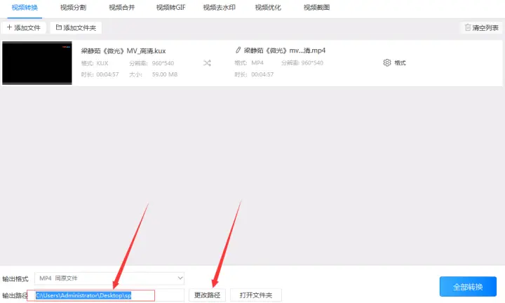 4、把“输出格式”设置为‘mp4同原文件’后调整好“输出路径”。在调整‘输出路径’时可以直接把路径写入到输入框中,也可以把路径拷贝出来然后粘贴到输入框,或者在输入框右边的‘更改路径’按钮中选择需要输出的路径。