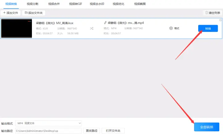 5、最后可以依次点击软件中鼠标悬停出现的“转换”按钮依次转换视频,也可以直接点击软件右下角的“全部转换”按钮统一把kux格式转换成mp4。在转换格式时软件会有一个转换的进度条,进度条到达100%时就表示已经转换好格式了。最后只需点击覆盖在“转换”按钮上的“打开”按钮就可以直接到达输出路径打开转换后的mp4文件了。