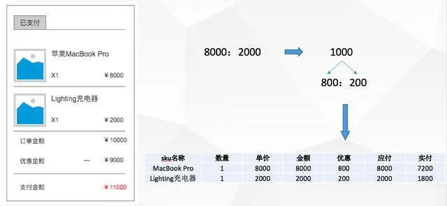 但对于京东来说,这100块钱并不是直接减100这样来登记的,其不在订单里,是以商品的金额订单里,商品金额的比例分拆优惠的,这就是金额拆分系统在做的一个工作。