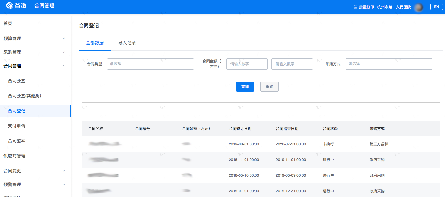 就拿供应商来说,单是2018年,杭州市一医院的供应商合同就超过了500份。如果还是传统的管理模式,供应商的管理会非常杂乱:什么时候合同到期?哪些尾款需要在期限内收回?供应商对接人变动了应该找谁?信息不能及时更新,重要的事情容易被忽略,更严重会直接造成经济损失。