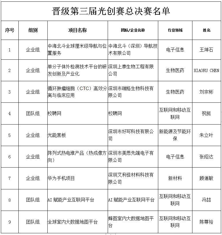 经过3天比拼,100家企业及团队从205个参赛路演项目中突围,获得第十一届深圳市创新创业大赛半决赛、第三届光明区创新创业大赛总决赛晋级名额。100个参赛项目晋级深圳市赛,包括53个企业组项目及43个团队组项目,按照赛制规定,行业赛总成绩的前9名直接晋级光明区总决赛,其中包括6个企业组项目及3个团队组项目。
