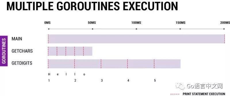 在上面的程序中,我又修改了一下输出语句使得我们可以看到每个字符或数字的输出时刻。理论上主协程会休眠 200ms,因此其他 Go 协程要赶在主协程唤醒之前做完自己的工作,因为主协程唤醒之后就会导致程序退出。getChars协程每打印一个字符就会休眠 10ms,之后控制权就会传给 getDigits 协程,getDigits 协程每打印一个数字后就休眠