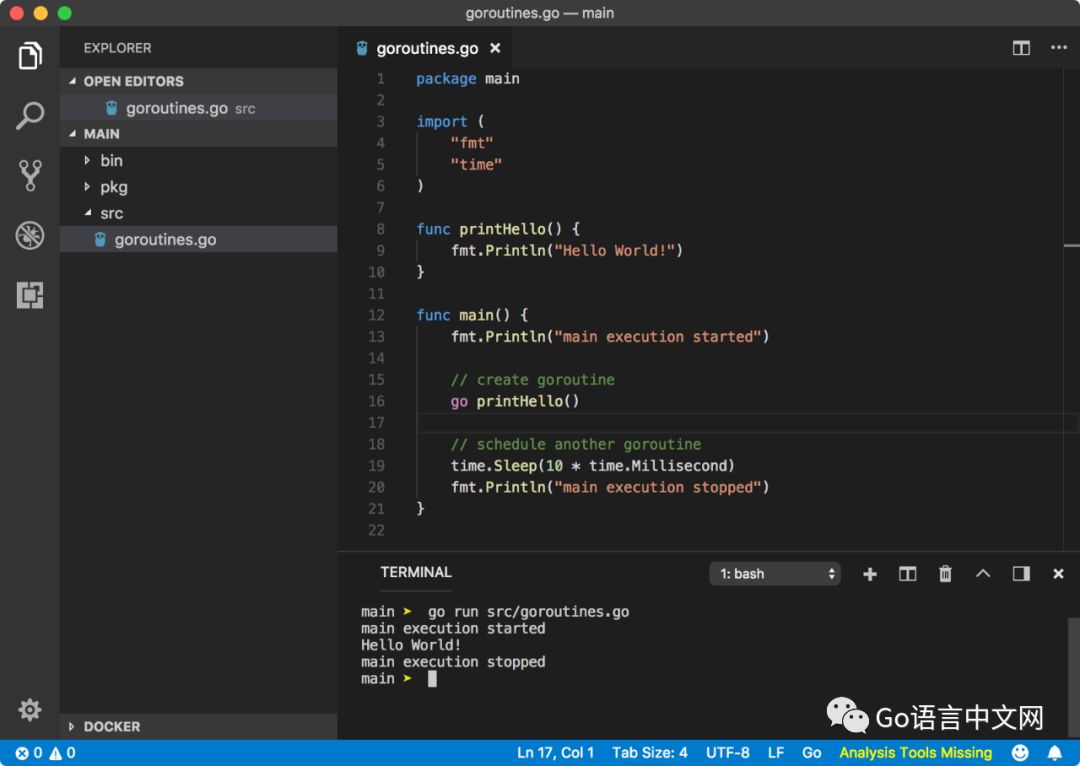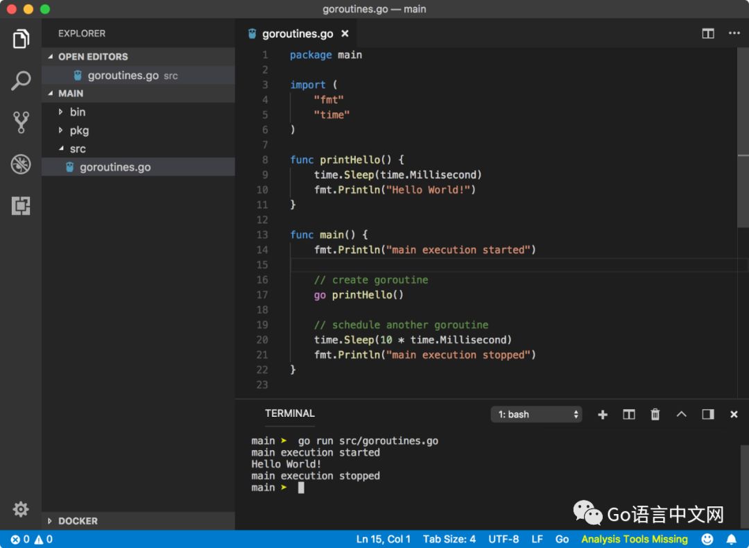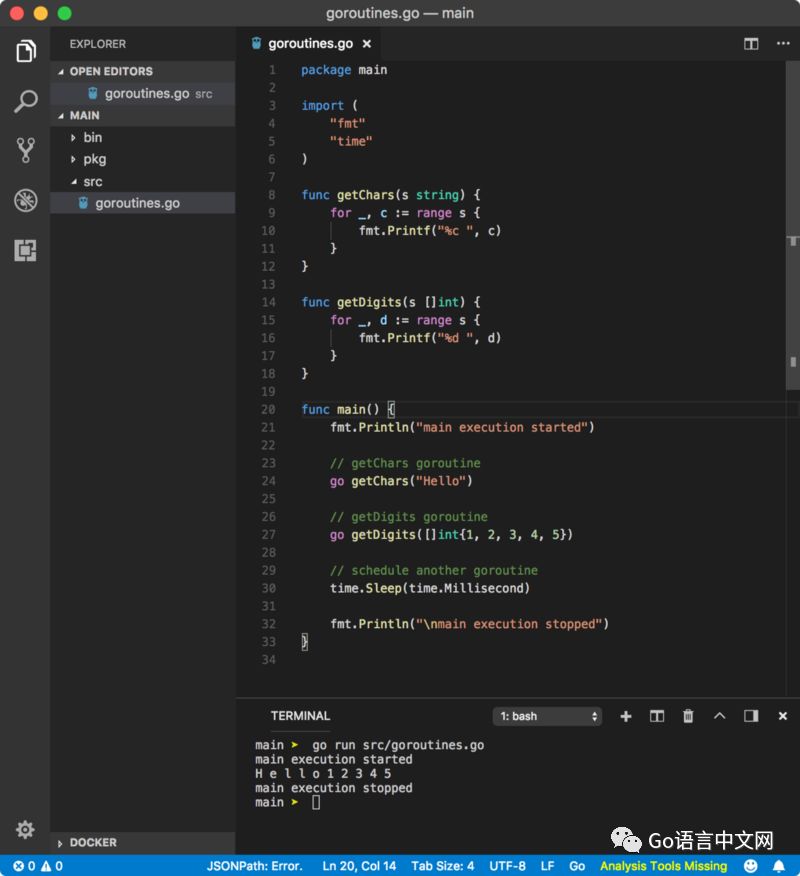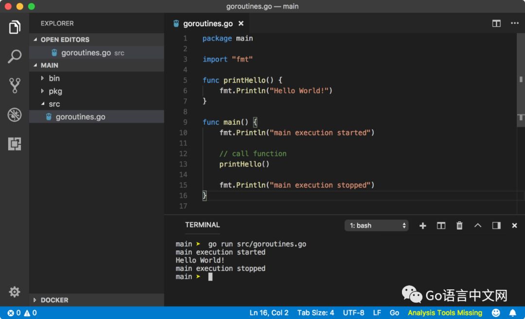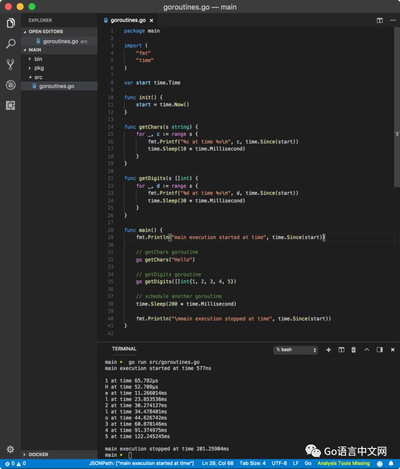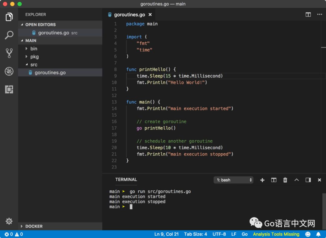 根据 Go 协程的语法,我们在函数调用的前面增加了一个 go 关键字,之后程序运行正常,输出了以下的结果: