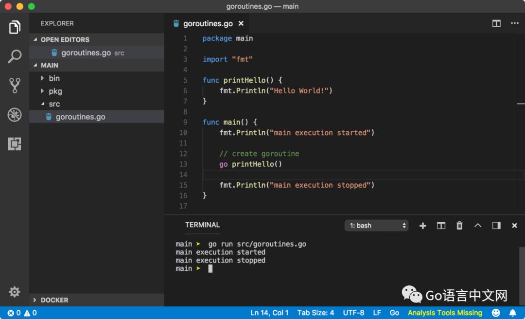 Go 中提供了一个关键字 go 来让我们创建一个 Go 协程,当我们在函数或方法的调用之前添加一个关键字 go,这样我们就开启了一个 Go 协程,该函数或者方法就会在这个 Go 协程中运行。
