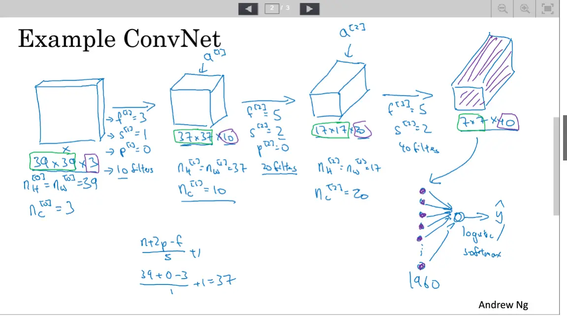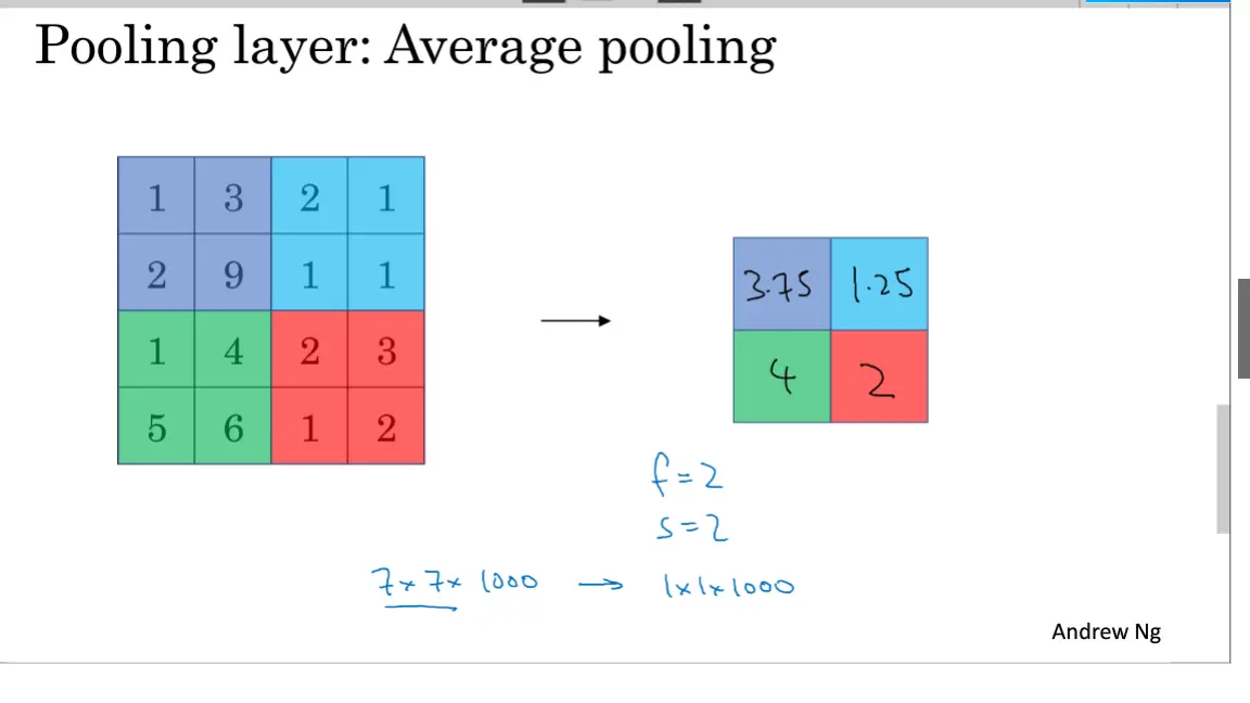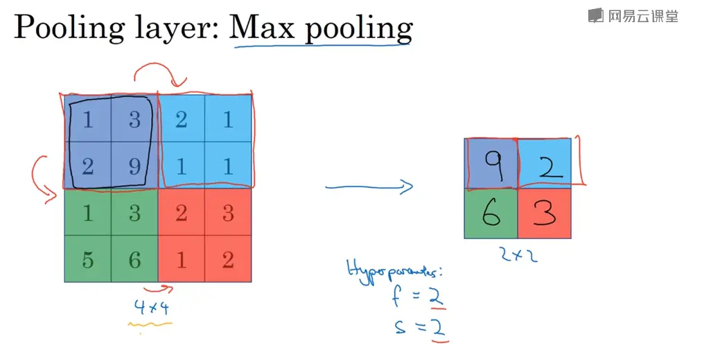 10.常见的池化层:最大池化(Max pooling),平均池化(Average pooling)。常用参数f=2,s=2,效果相当于表示层高度宽度缩减一半。最大池化层即对邻域内特征点只最大,最大池化能减小卷积层参数误差造成估计均值的偏移造成的误差。平均池化即对邻域内特征点只求平均,平均池化能减小邻域大小受限造成的估计值方差增大造成的误差。