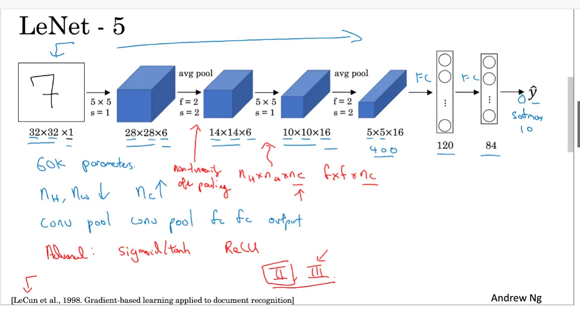 输入层:32* 32* 1(代表黑白照片)。卷积层:过滤器为5* 5 为6个,步长s = 1,padding为0。池化层:参数(f = 2,s = 2),让整个高度宽度减小了一倍。卷积层:过滤器为5 * 5共16个,padding为0。池化层:参数(f = 2,s = 2),高度和宽度减小一倍。全连接层:FC1,120个神经元。FC2,84个神经元。